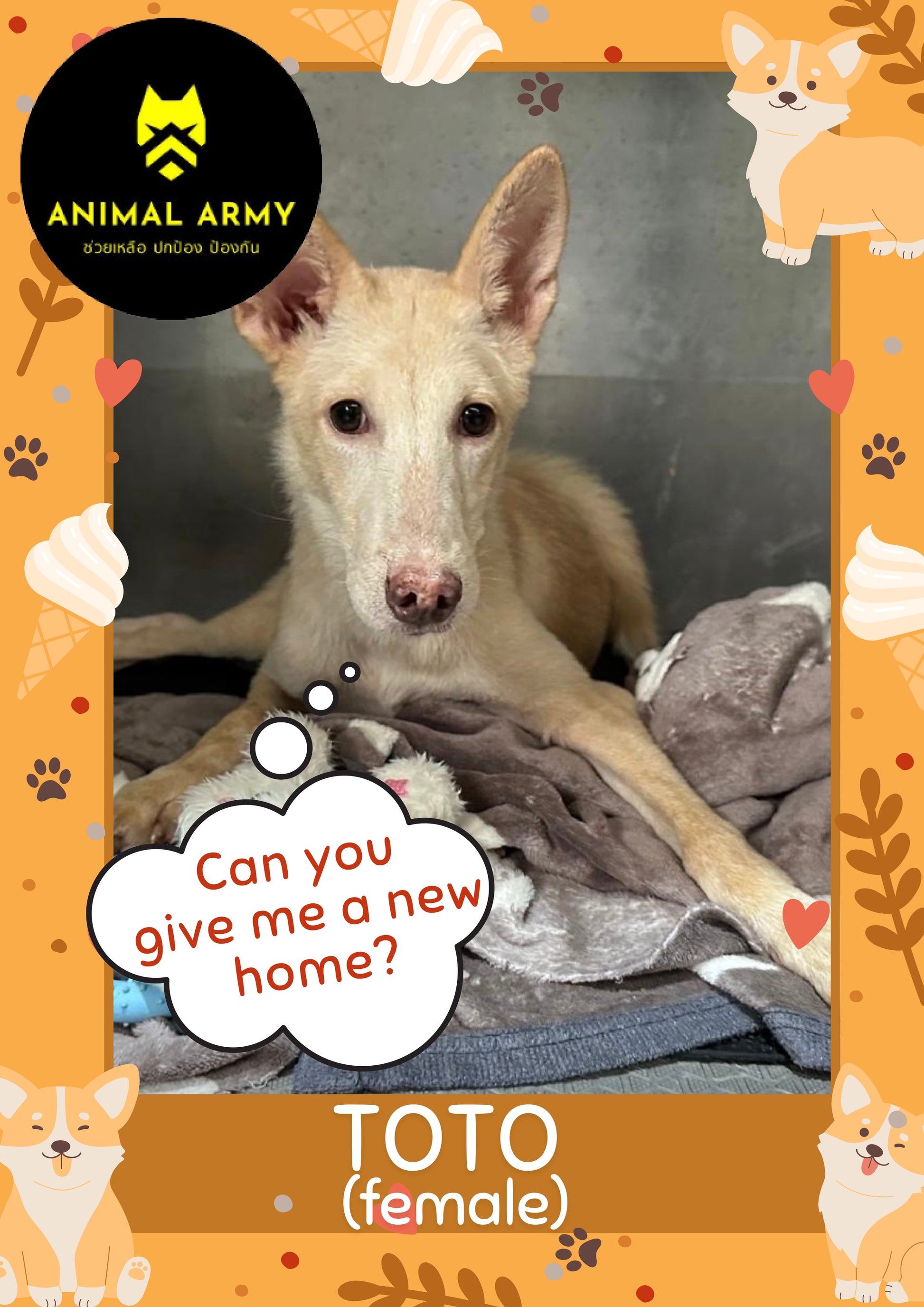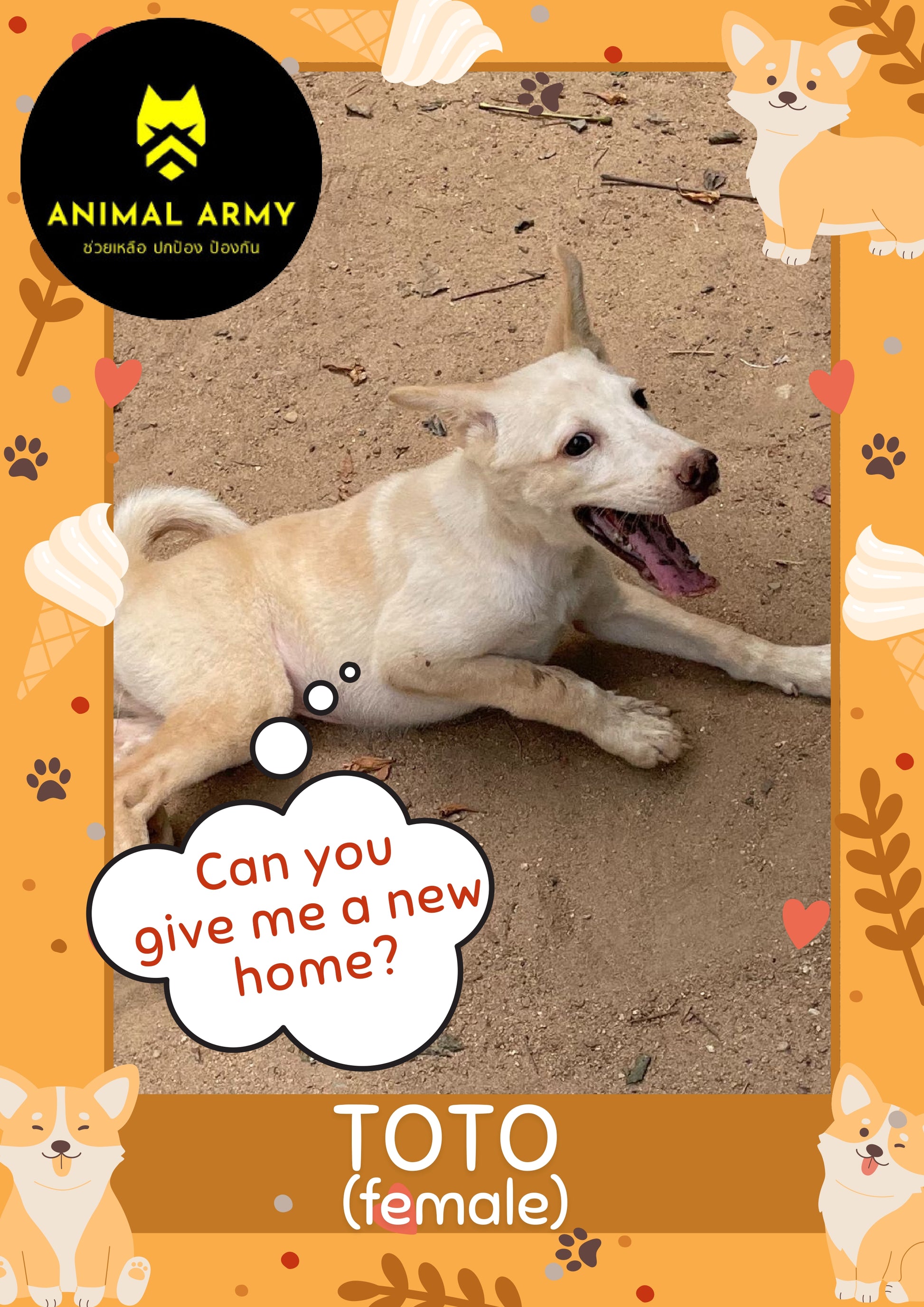 Toto (ตัวเมีย): Toto เป็นสาวน้อยที่พิเศษมาก! เธอเคยได้รับบาดเจ็บที่กระดูกสันหลัง ซึ่งส่งผลต่อการเดินและการยืน เนื่องจากอัมพาตชั่วคราว แต่ทุก ๆ วัน Toto กำลังแข็งแรงขึ้นเรื่อย ๆ และมีความตั้งใจแน่วแน่ว่าสักวันหนึ่งจะสามารถพึ่งพาตัวเองได้ หลังจากการออกกำลังกายและกายภาพบำบัดเป็นประจำ Toto ชอบการกอดและความรัก เพราะหลังจากที่เธอเดินและเล่น เธอมักจะเหนื่อยง่ายและต้องการพักผ่อน เธอจะเหมาะกับครอบครัวที่มีเวลาและพร้อมจะช่วยให้เธอสร้างความแข็งแรงขึ้นอีกครั้ง